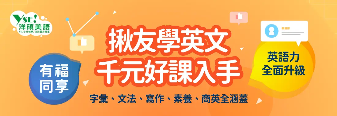 找朋友一起學英文享課程優惠價,還能用1,000元加購原價上萬元的超實用課程(大一微積分、字彙、文法、寫作、素養、商用英文...等),讓學習更全面!