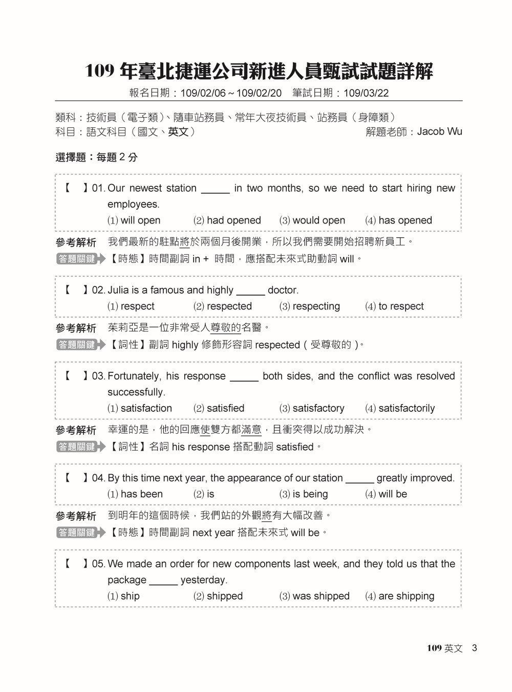 捷運考試2021試題大補帖【英文】(103~109年試題)(測驗題型)