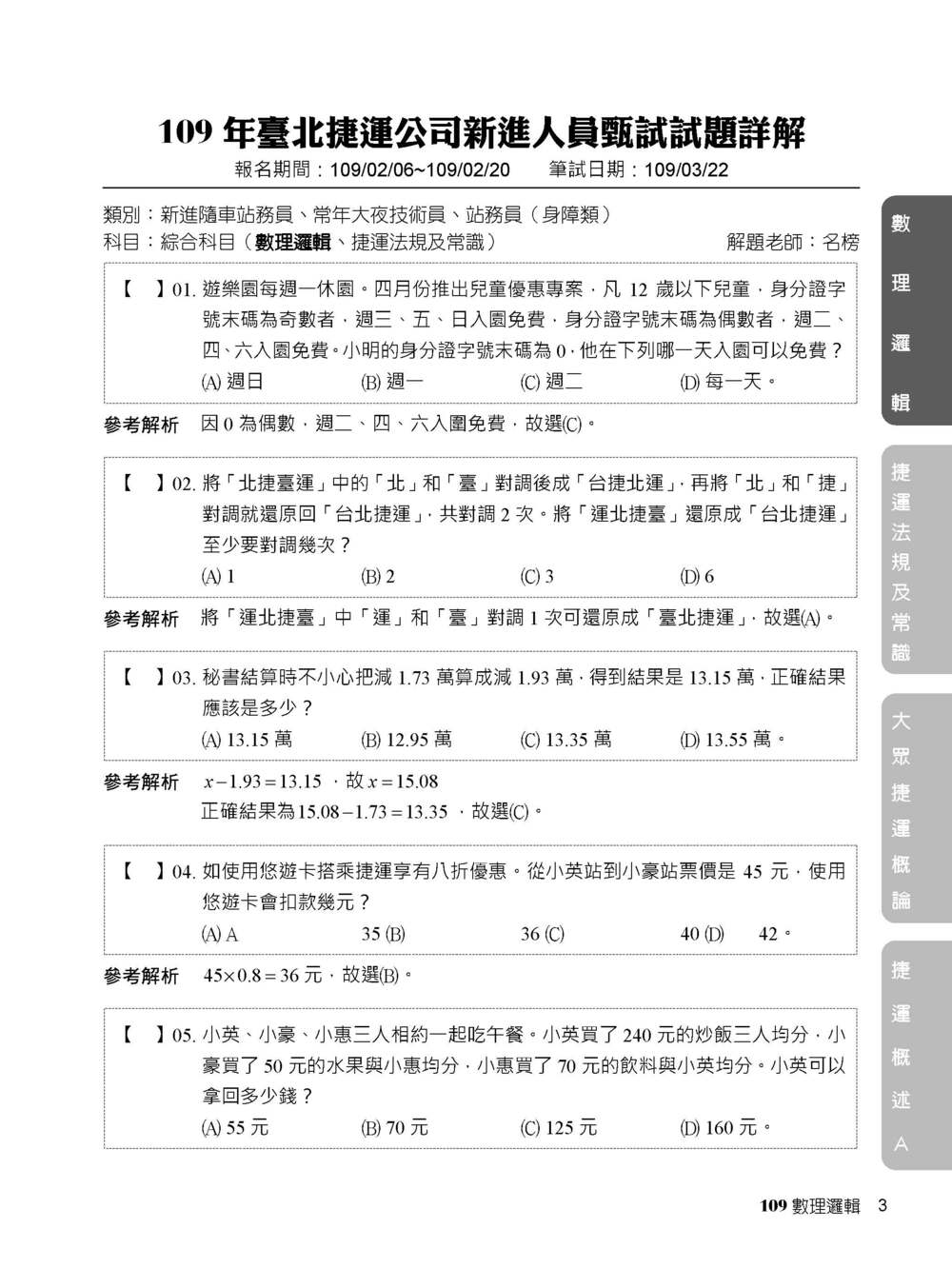 本書收錄科目包含:數理邏輯、捷運法規及常識、大眾捷運概論、捷運概述A。