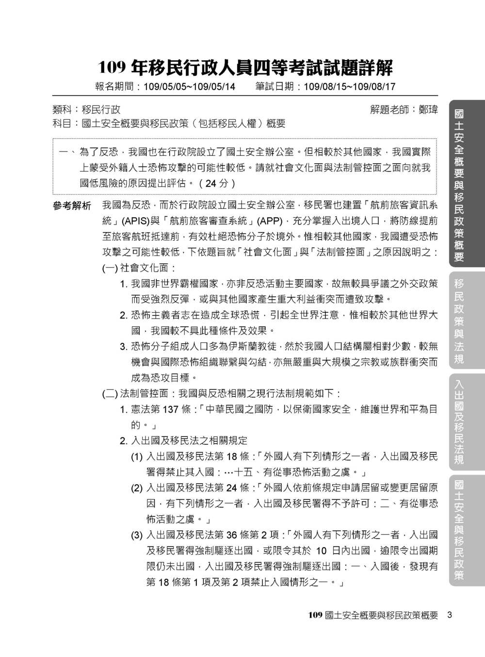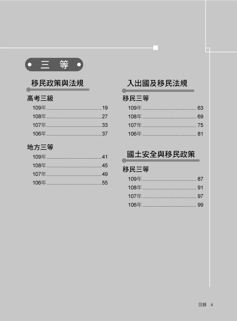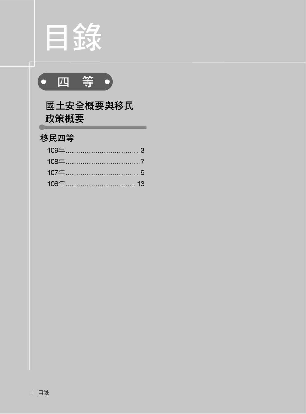 本書收錄科目包含:國土安全概要與移民政策概要、移民政策與法規、入出國及移民法規、國土安全與移民政策