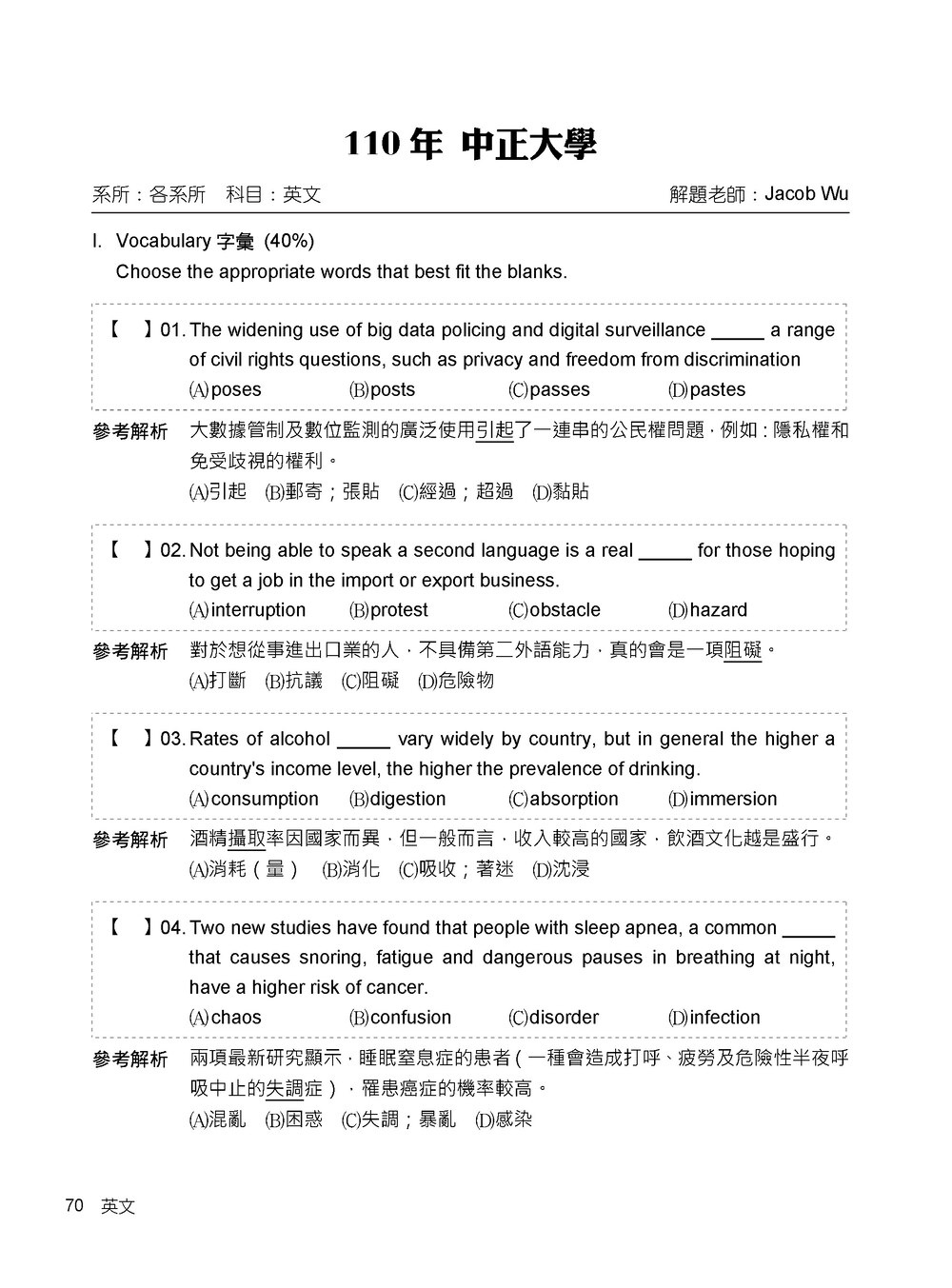 研究所2022試題大補帖【英文】(108~110年試題)[適用台大、政大、暨南、中正、南大、成大研究所考試](CD0152)