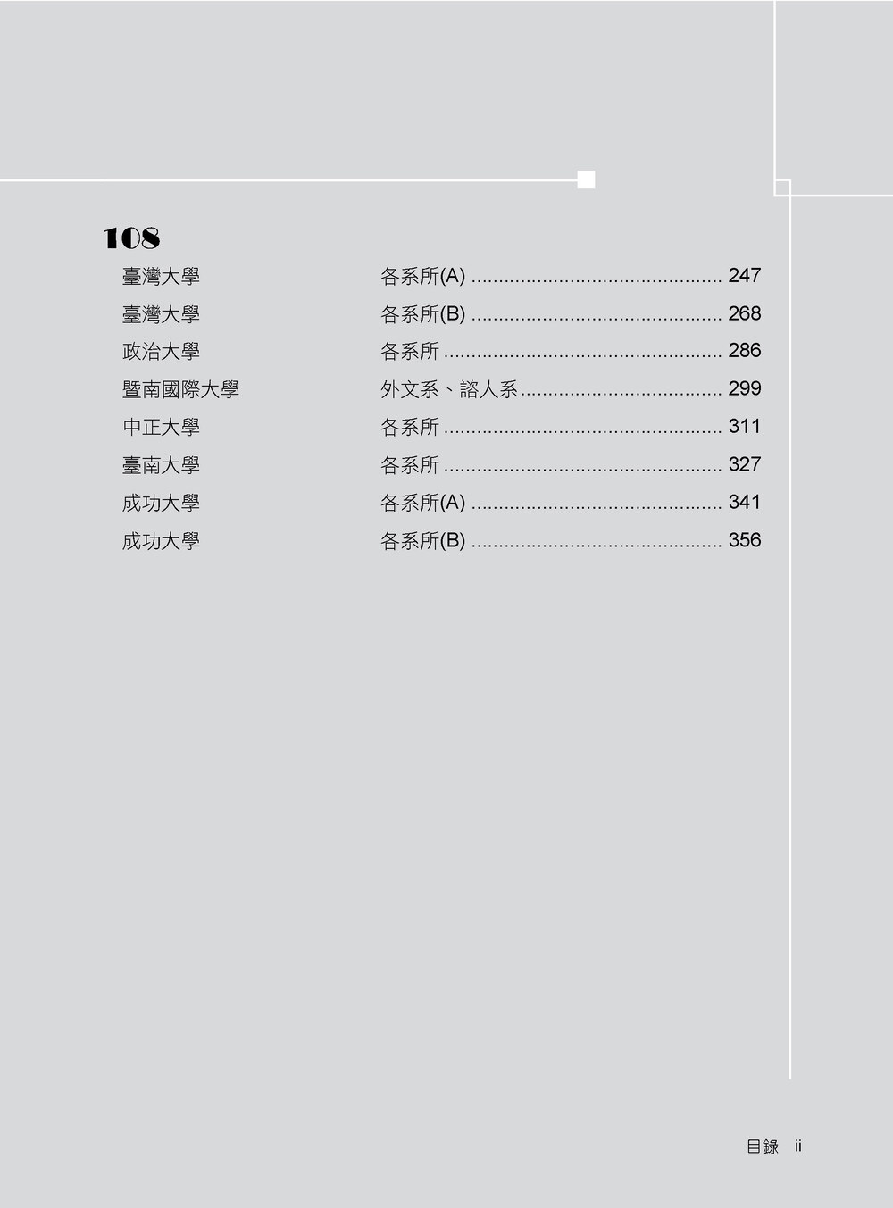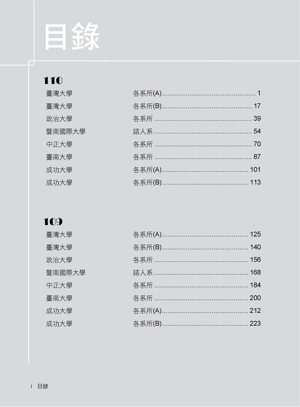 本書收錄學校:台灣大學、政治大學、臺南大學、中正大學、暨南國際大學、成功大學