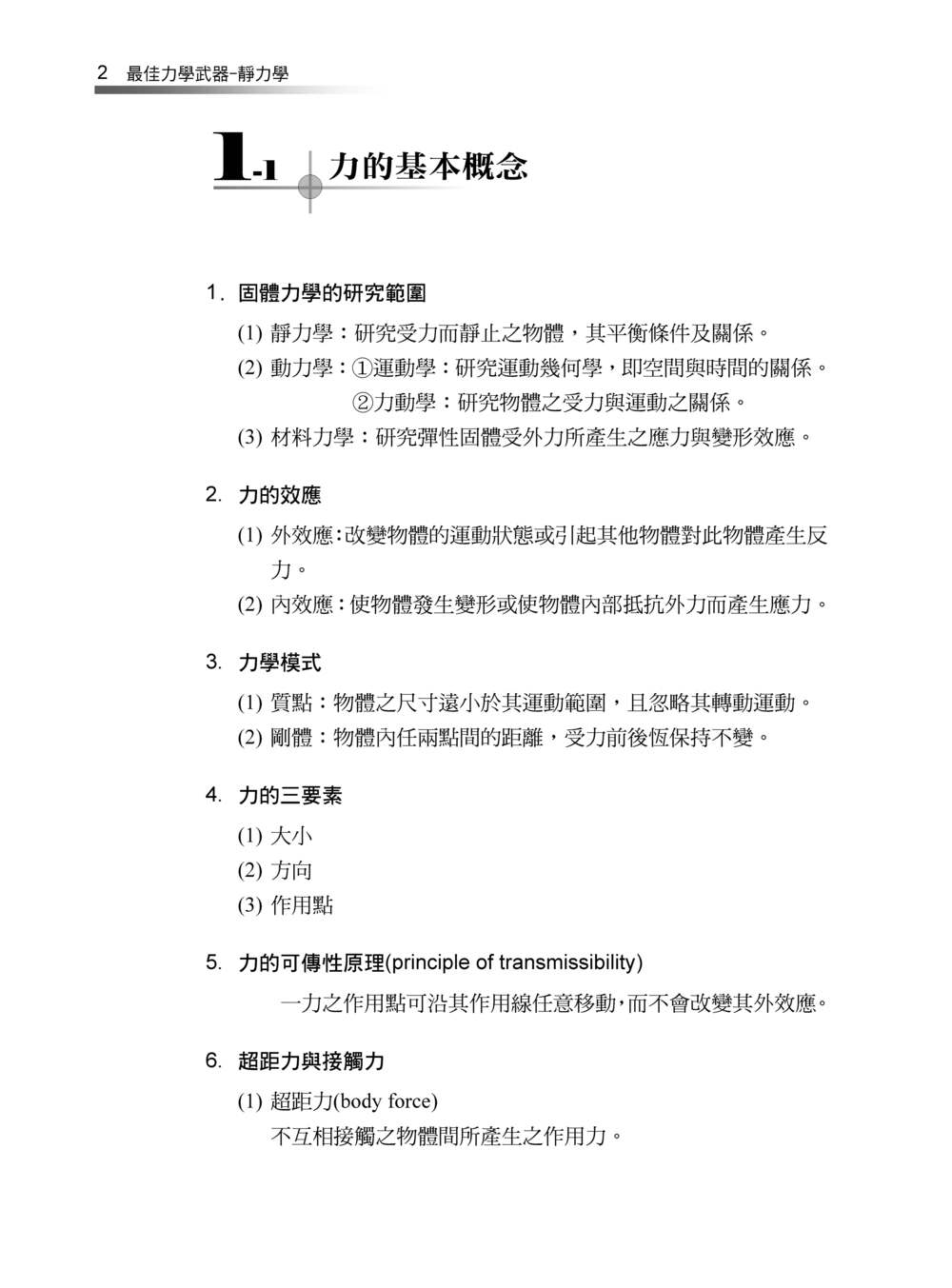 力學的分析可以說是一般工程設計上最基本的考慮,設計任何機械或結構時必定是從固體力學中的平衡條件開始,依序至運動、強度及剛性等多方面的考量。固體力學主要在探討固體受力的作用後所產生之一系列的力學行為,如平衡條件之分析、移動與轉動運動之描述、振動行為之控制、應力與變形效應之計算等,而其相應之課程中又以靜力學最為基礎。所以完整且紮實的靜力學觀念,有助於同學日後能有效的學好動力學與材料力學等相關科目。