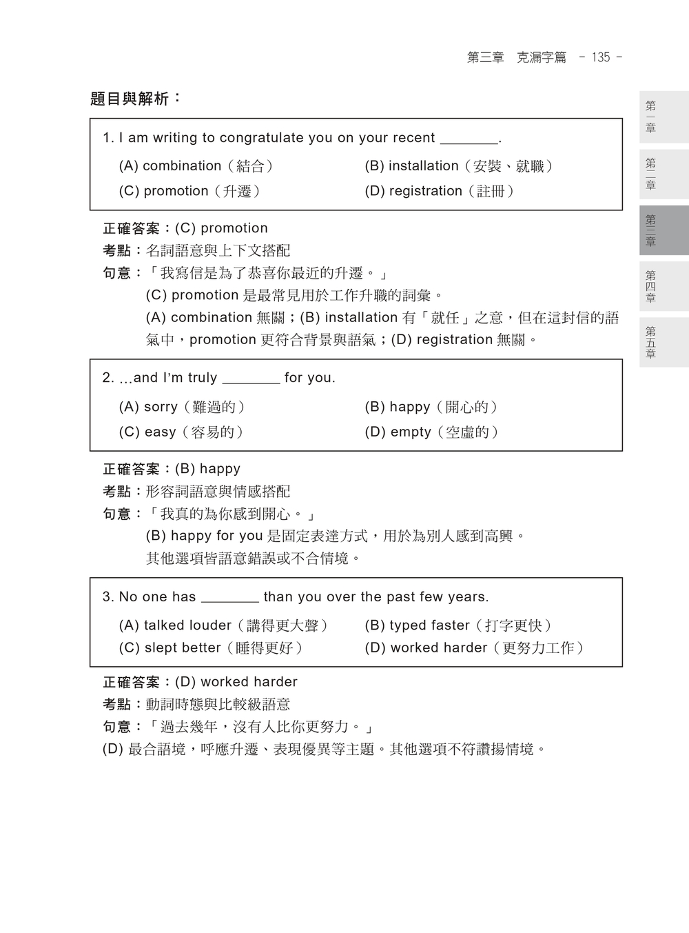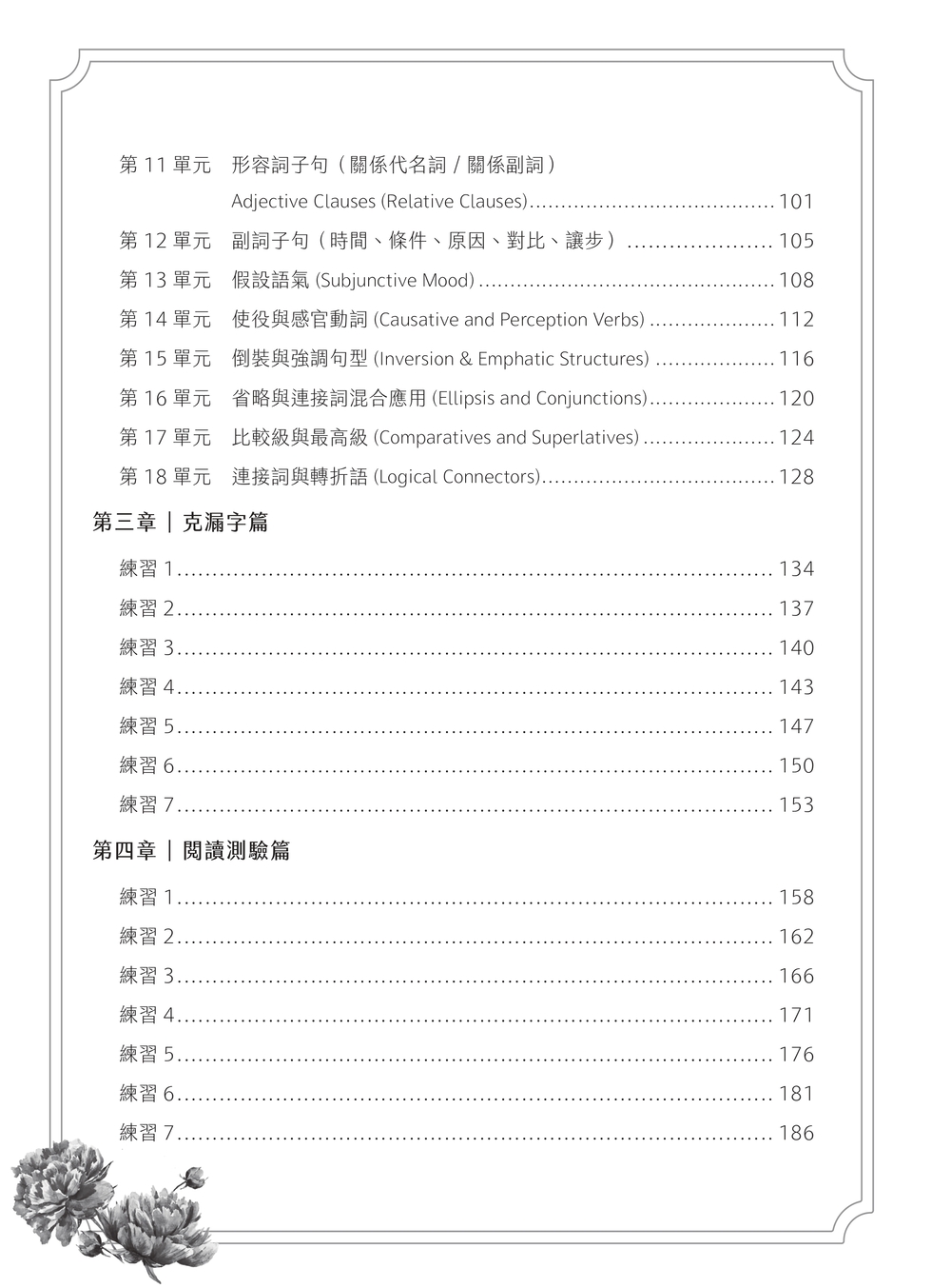 全書共分五章,涵蓋「單字篇」、「文法篇」、「克漏字篇」、「閱讀測驗篇」、「翻譯篇」,循序漸進,從字彙基礎到整合應用,逐步強化語言能力。