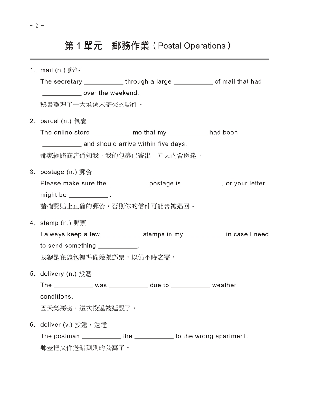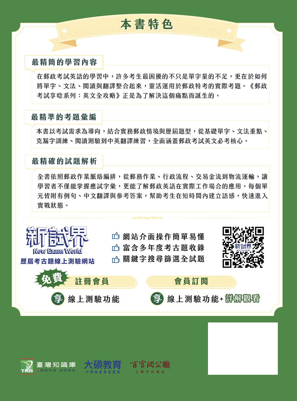 內容涵蓋郵政特考英語出題方向與常用專業詞彙,搭配清楚的中譯、例句與解析,是準備郵政英文的最佳夥伴。
