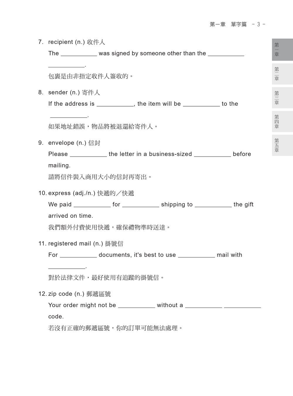 第五章特設「翻譯篇」,從簡單句型到實務郵政表達,讓學習者熟悉英譯中、中譯英的關鍵句構與用語習慣。