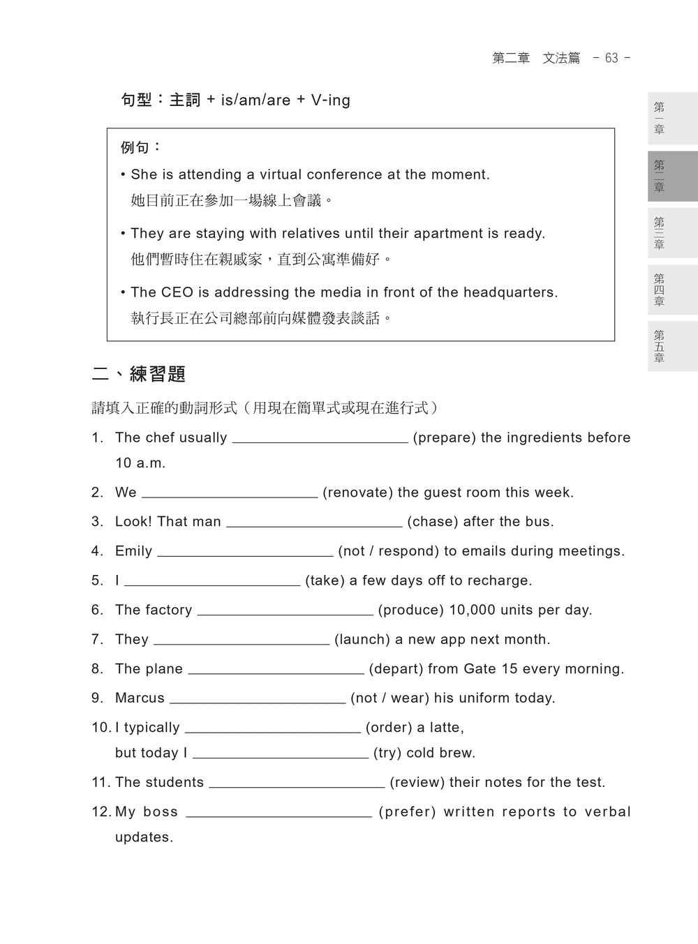每單元皆附中英對照例句與填空練習,透過實際操作鞏固記憶,減少背誦壓力,強化學習成效。