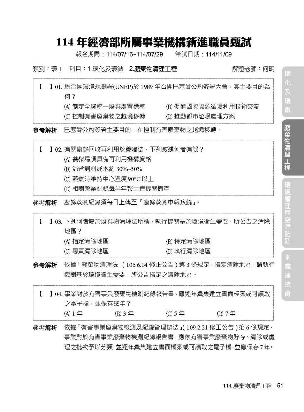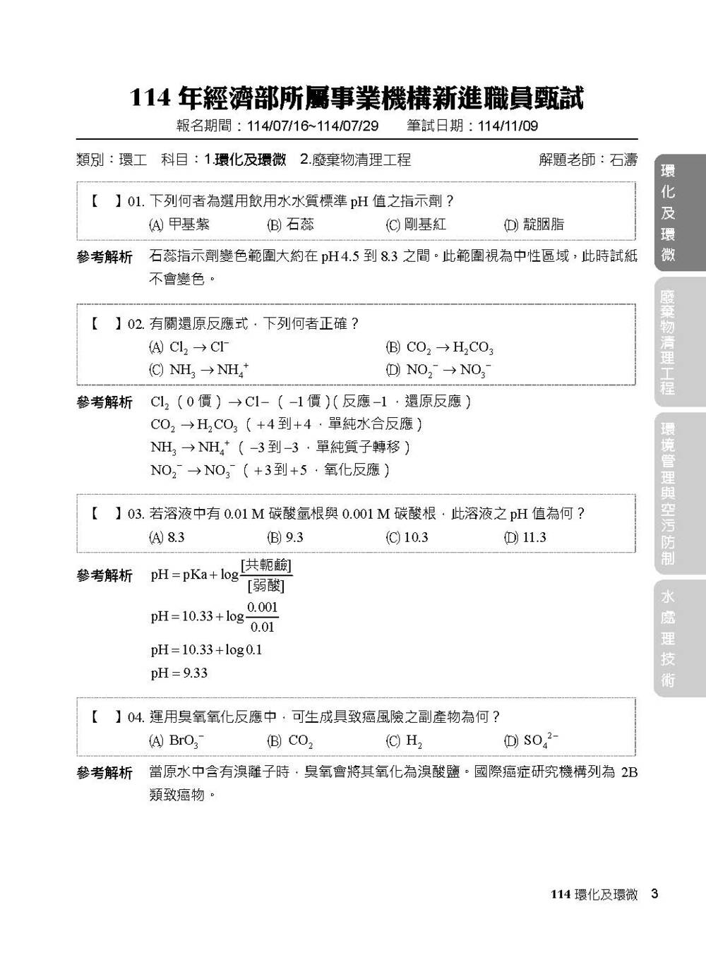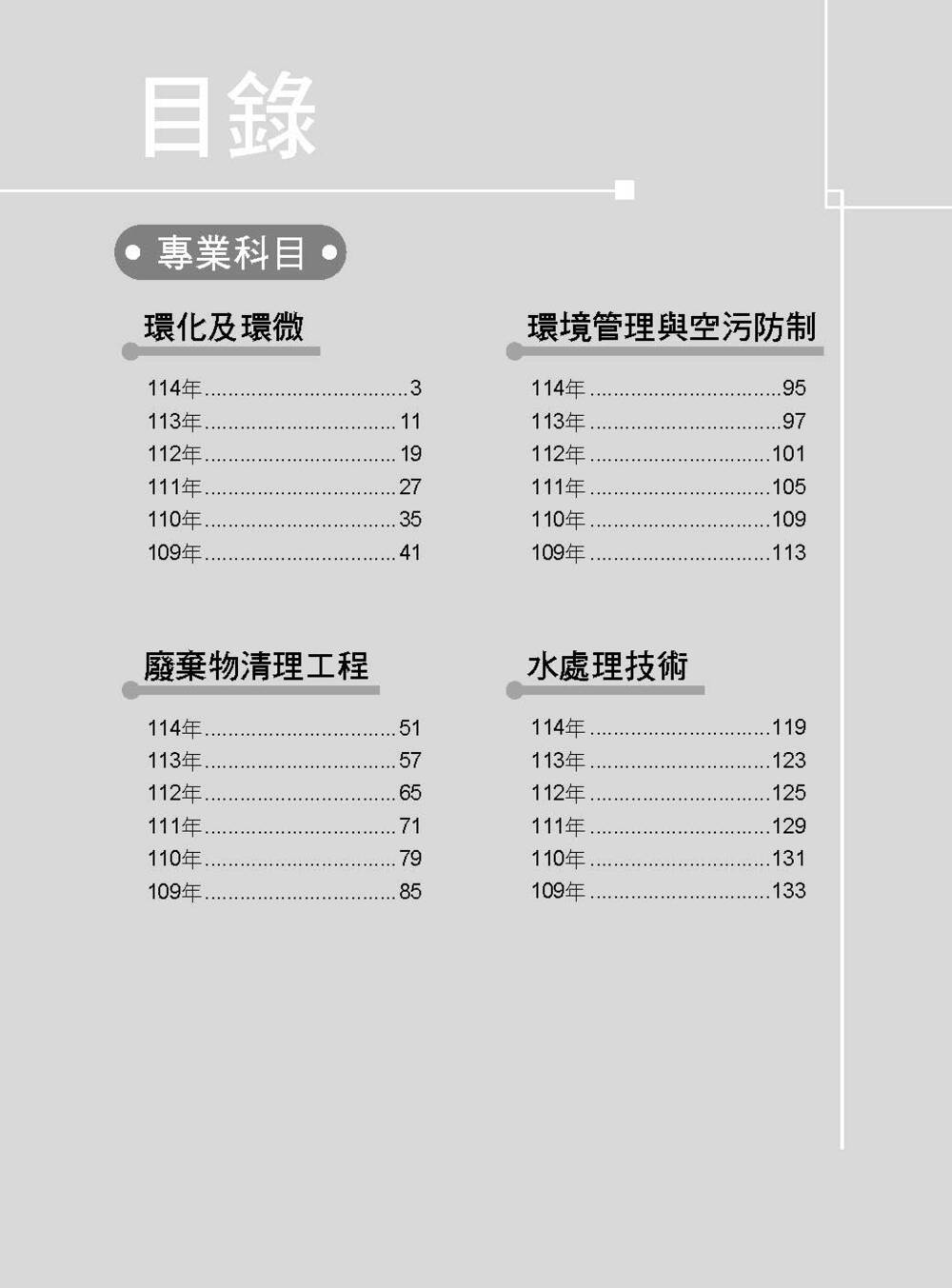 本書收錄包含環工類專業科目(A)環化及環微、廢棄物清理工程;以及專業科目(B)環境管理空污防制、水處理技術。