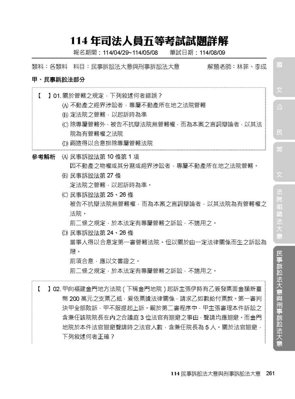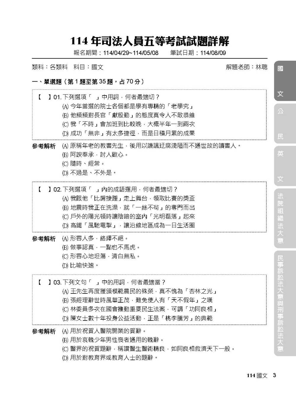 3. 右頁附頁籤以標示該份試題的科目,方便書籍使用者快速查找想要練習的科目。