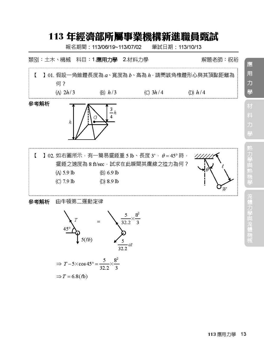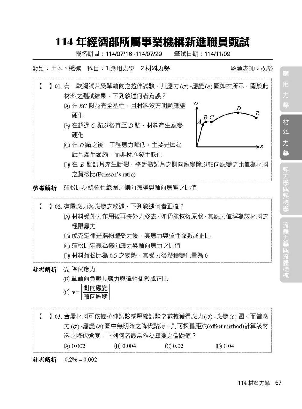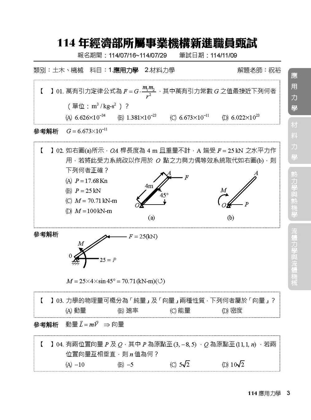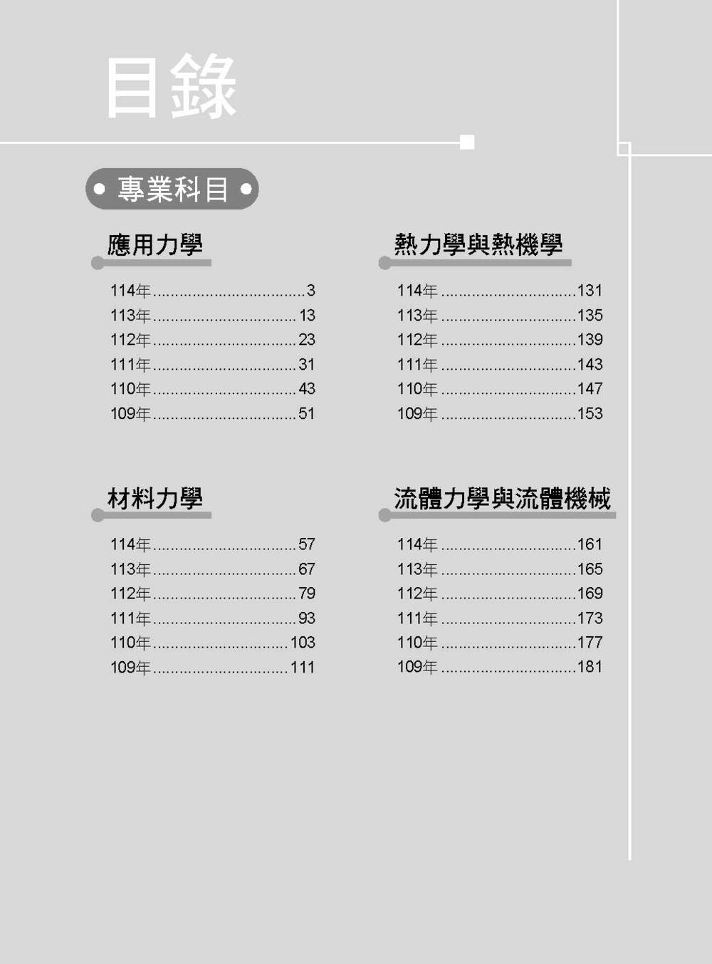 本書收錄包含機械類專業科目(A)應用力學、材料力學;以及專業科目(B)熱力學與熱機學、流體力學與流體機械 。