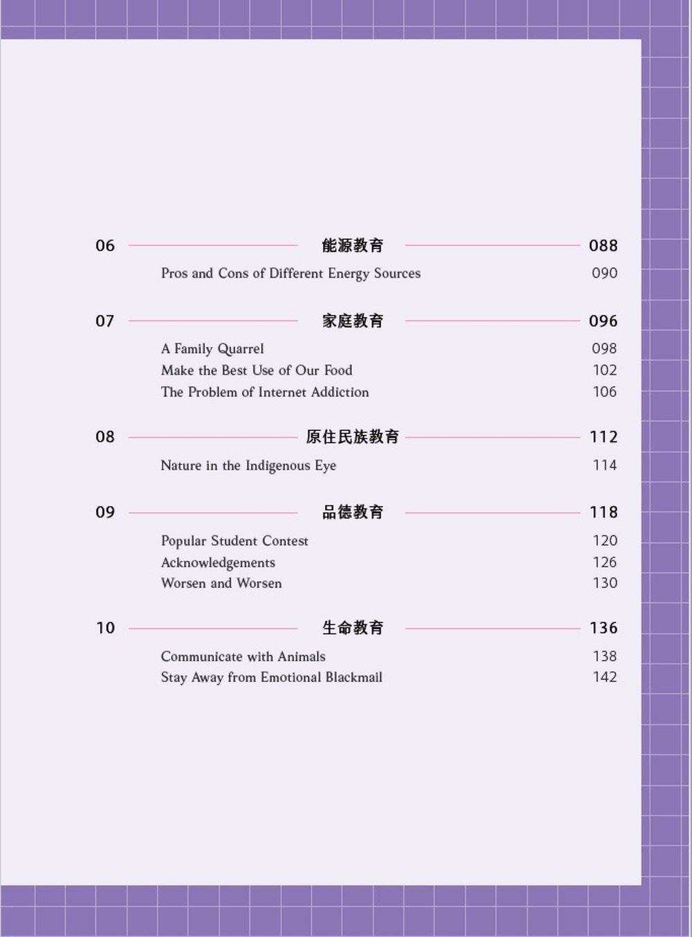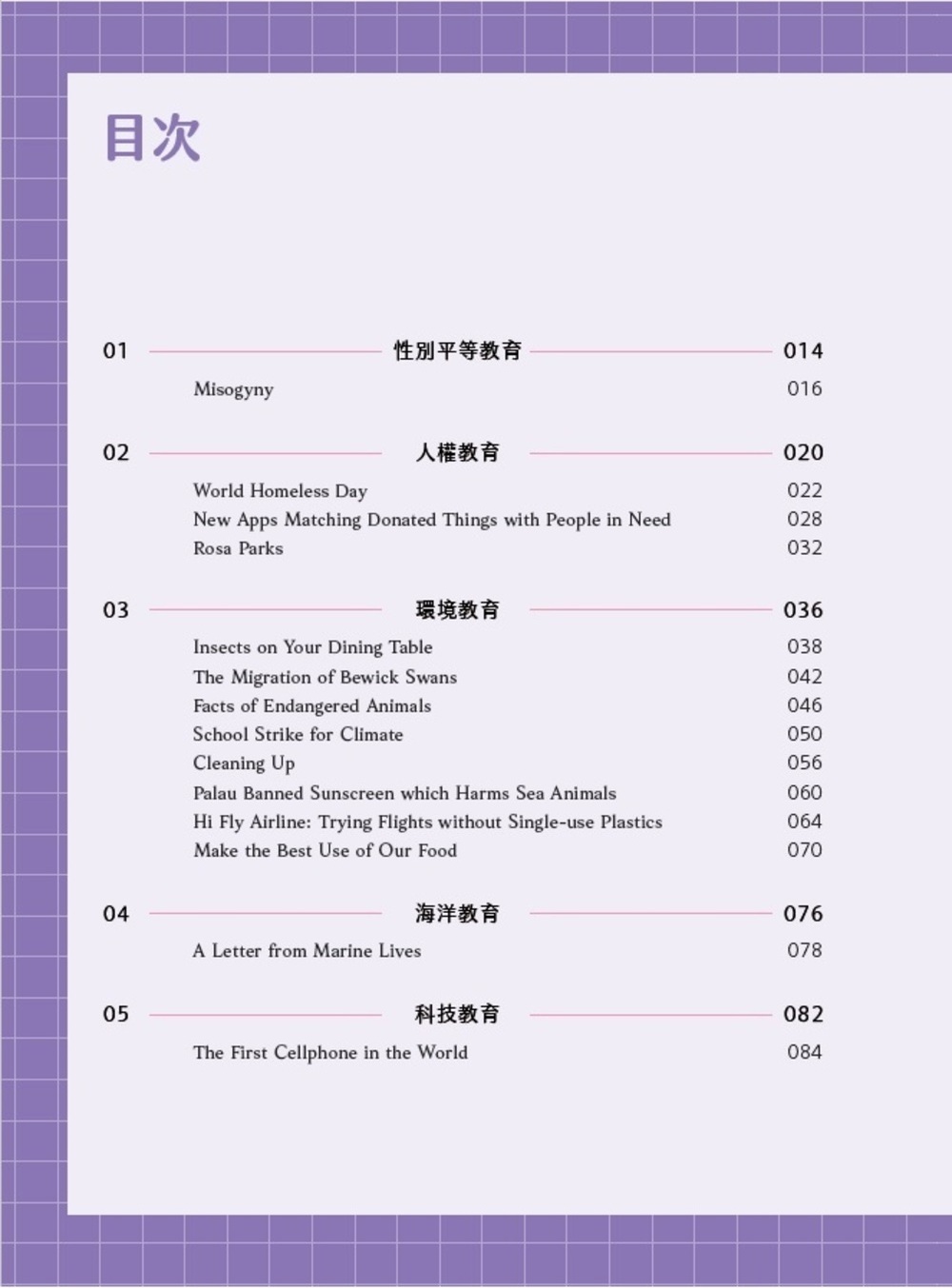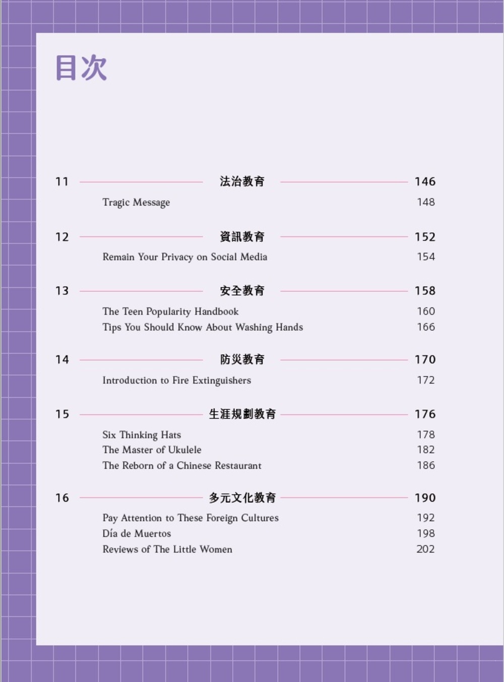 本書《素養檢定:國中英文閱讀題本 閱讀素養》有三點特色,首先中華未來學校教育在素養導向教育計畫的部分成果,參考全國優質教師參與「素養導向一貫化課程創新教案與命題設計」的試題成果,並由學會研究人員等進行編修創作而成。第二個特色是依108課綱的19項教育議題分類,精挑相關文本內容,以擴展孩子閱讀視野,避免閱讀偏食。第三個特色以「閱讀策略與歷程」為規準,以符合學測等大考之趨勢。