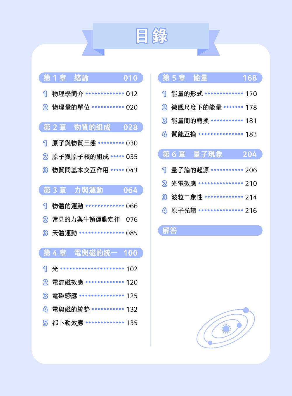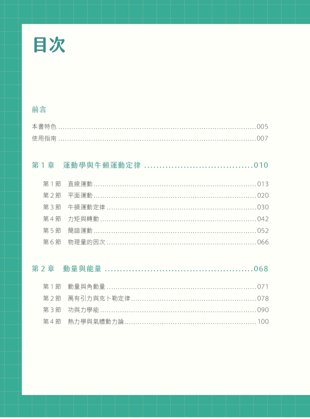 一、觀念綜整依據高一物理所學單元進行排序,依序介紹各單元知識點,以簡潔精練的文字使學生更好地掌握重點,並配合相關補充與範例,搭配類題練習,幫助學生鞏固概念、提升應用力。部分內容另設有「觀念便利貼」,讓知識脈絡更加清晰。