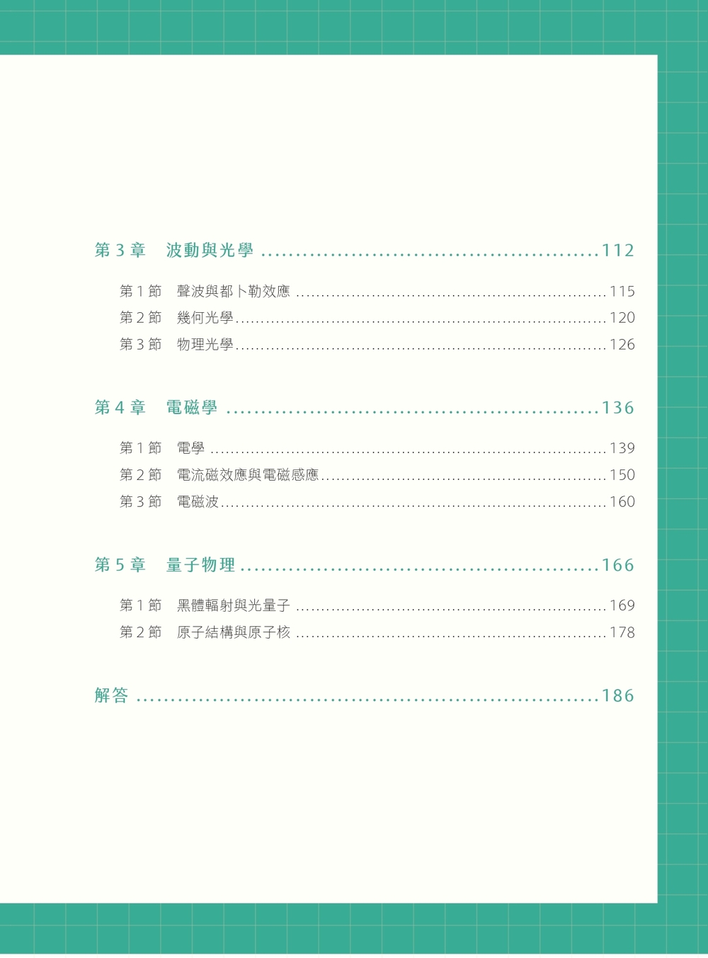 本書因應新課綱與大考命題方向,集結第一線高中教師與學會教師群的力量,設計此多層次物理題組題探究書籍,目的在於培育學生物理先備知識、系統思考能力,深入理解物理模型的建立、演變之過程,同時利用三大類情境題組,讓學生能更有效率地整合知識、技能、態度,建構「主動探究與建立論證」的精神。