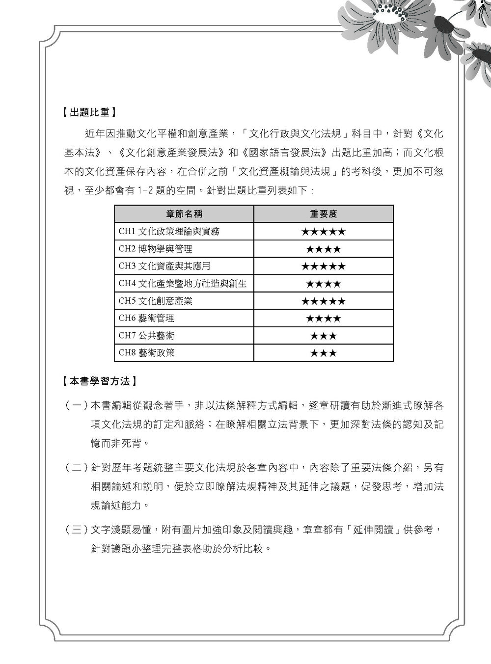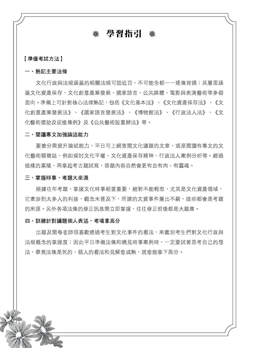 全書內容同步更新至最新文化行政與文化資產相關法規,結合國內外時事與案例分析。以制度運作與情境示例模擬出題方向,強化對實務與政策議題的理解與應用。