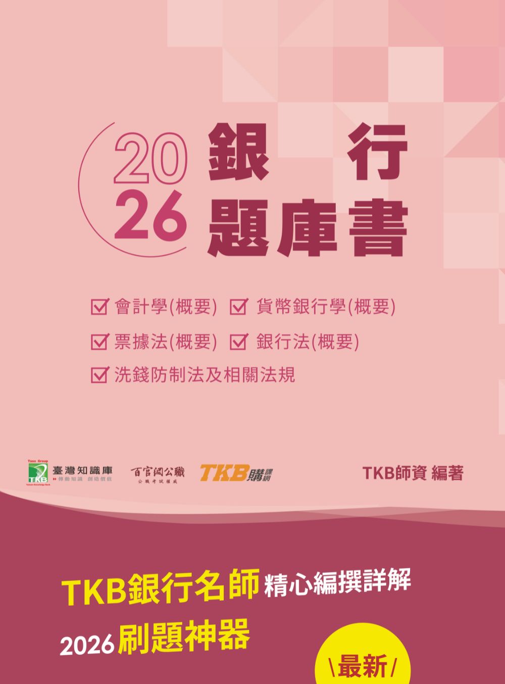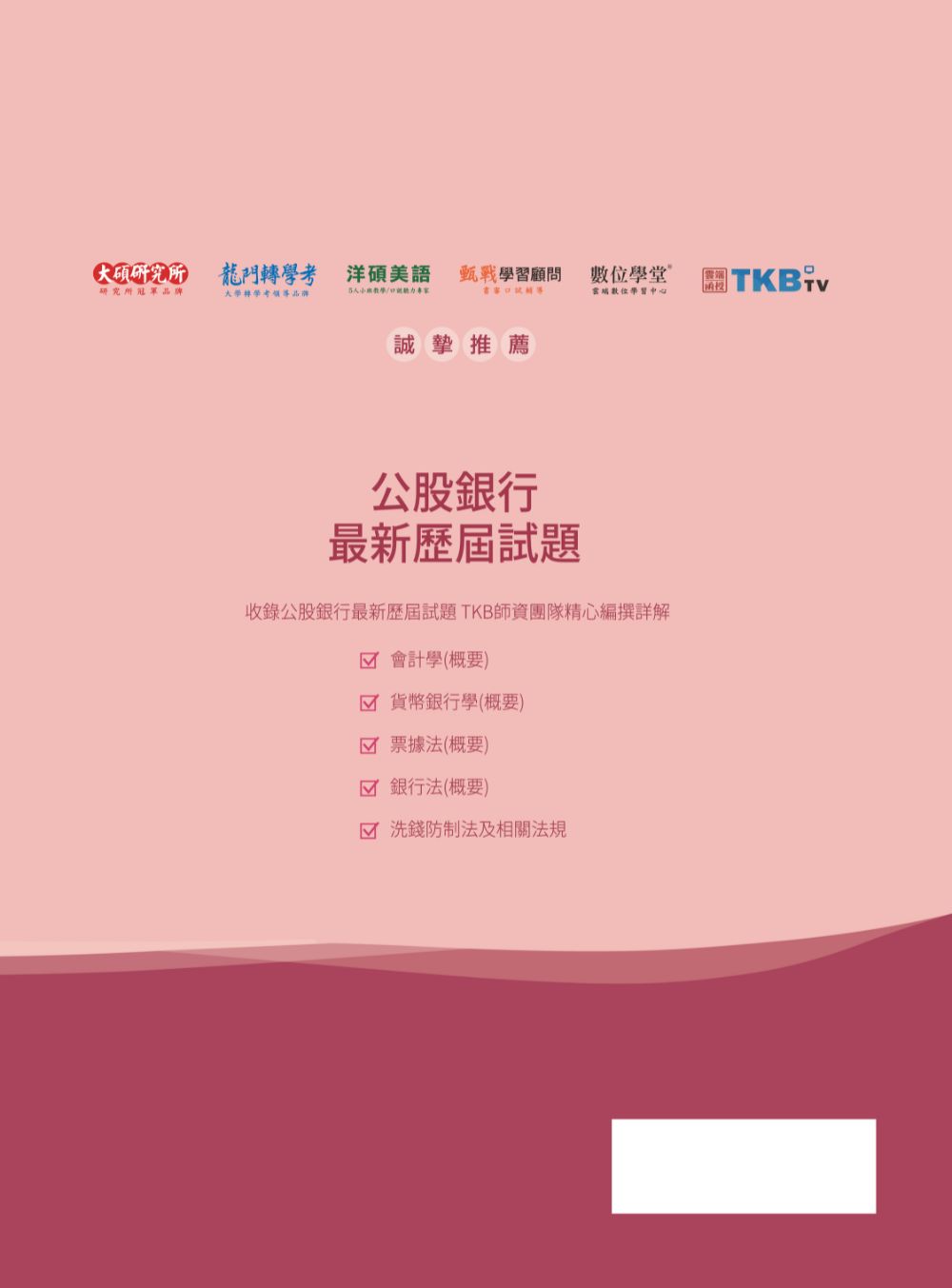 本公司出版銀行考試收錄完整各科考題,本書皆收錄該科目的114年考題及詳解,讓考生不需費力地上網爬文找歷屆試題,銀行考試所出版的各科專業科目試題書,透過有效整理歷屆考試重點,是一本非常適合用來當作考前衝刺的試題習書。