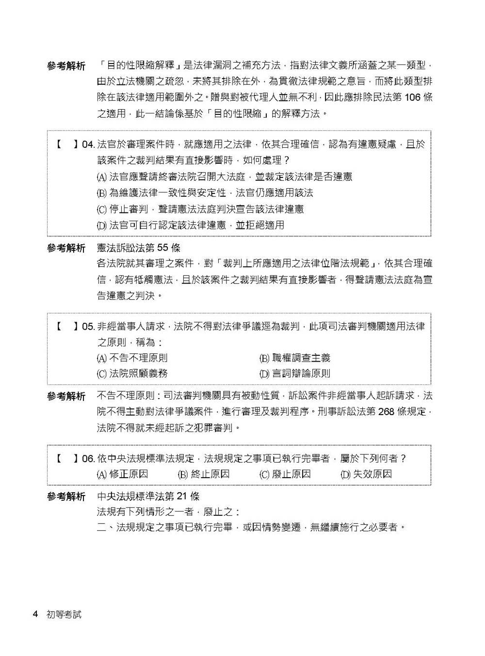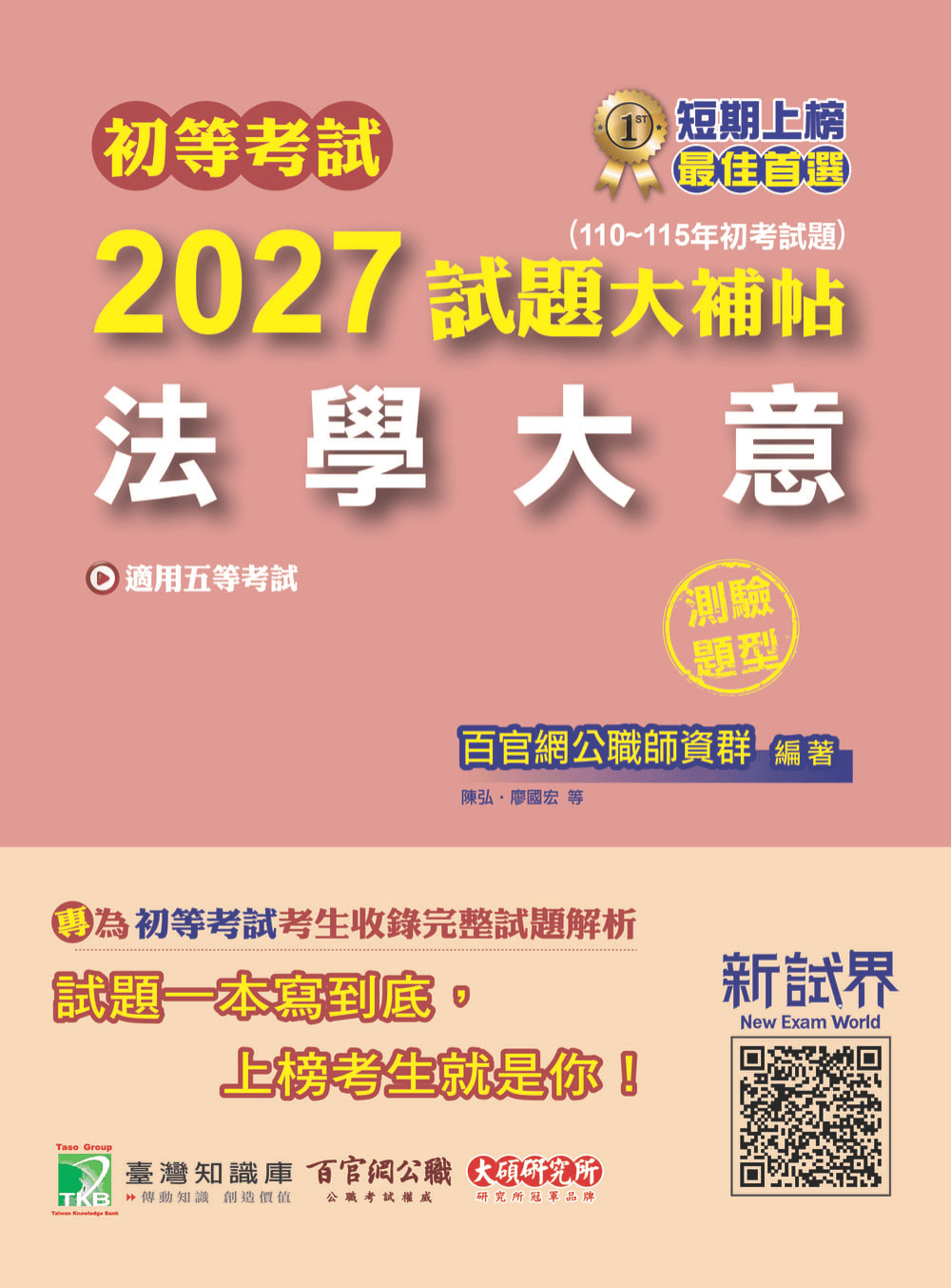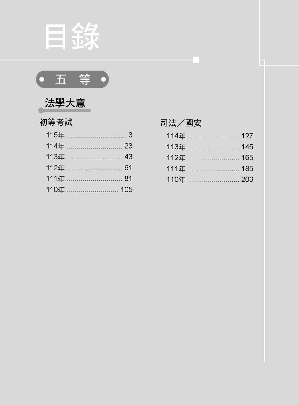 本書收錄初等考試【法學大意】110~115年的測驗試題詳解,幫助您一次準備全面應戰、熟悉題型順利上榜。