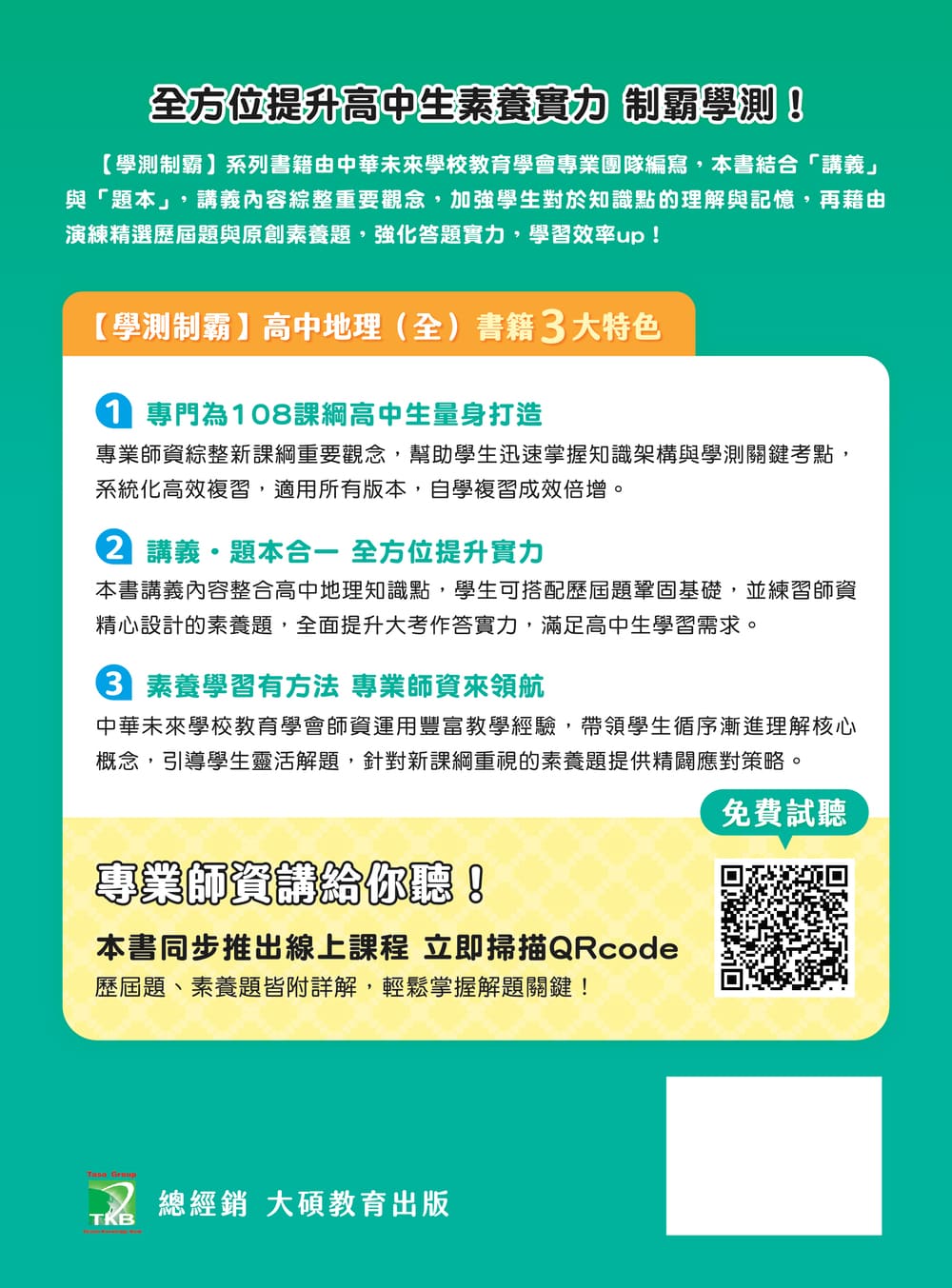 以108課綱內容作為主軸,講述高中地理的基本架構與重要觀念,並以素養為主軸選題,使學生能輕鬆快速掌握高中地理知識。