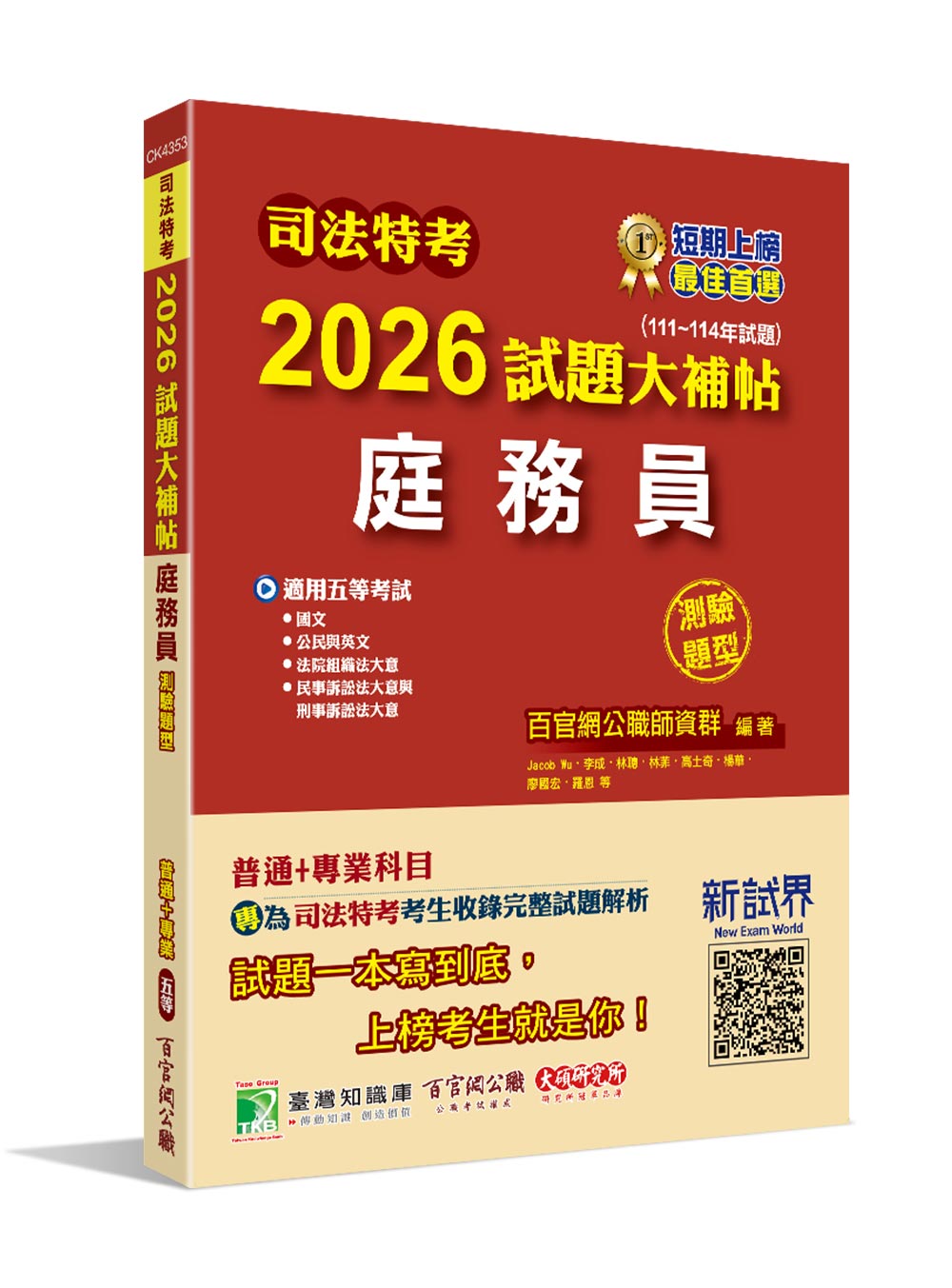 司法特考2026試題大補帖【庭務員】普通+專業(111~114年試題)(測驗題型)[適用五等/含國文+英文+公民+法院組織法大意+民事訴訟法大意與刑事訴訟法大意](CK4353)