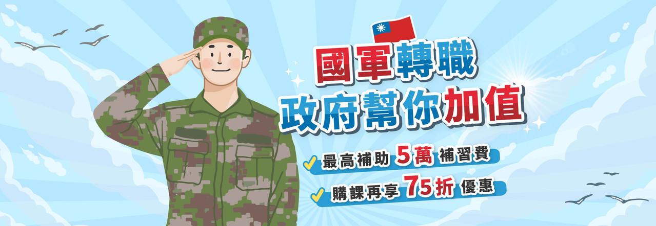 軍人轉職首選-公職、國營、銀行!政府補助最高五萬元補習費用(直接免錢!)購課再享75折優惠!