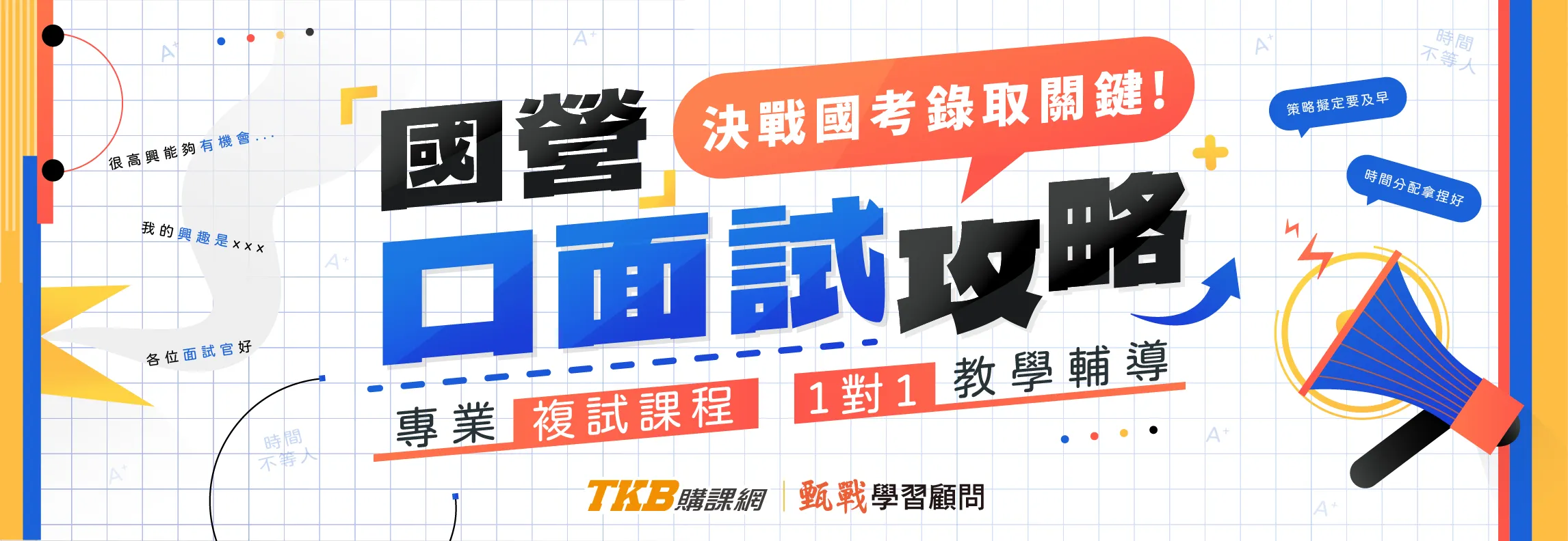 TKB購課網x甄戰學習顧問共同合作推出國營事業口面試輔導課程, 提供專業的口面試諮詢顧問,為你剖析國營面試流程、提供自傳撰寫技巧,透過一對一客製化面試輔導讓學習效率最大化,上榜最後一哩路也不馬虎!
