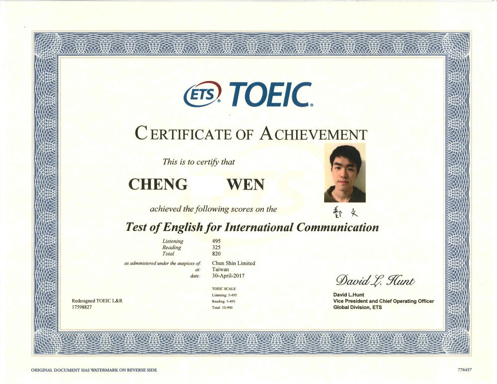 為期十二週的多益課程中,老師要我們每天都要練習聽力,也告訴我們考試前一個小時也要聽英文讓自己的耳朵打開,讓我順利的在這次考試聽力拿了495分的高分。十二週的課程也包含了三次的模擬考,在模擬試題的解題過程中,可以學到在作答的時間分配以及解題上的小技巧,例如要留50分鐘的時間做閱讀測驗等,讓我在寫閱讀測驗的時候比較有充裕的時間,不管對聽力或閱讀測驗都有很大的幫助。