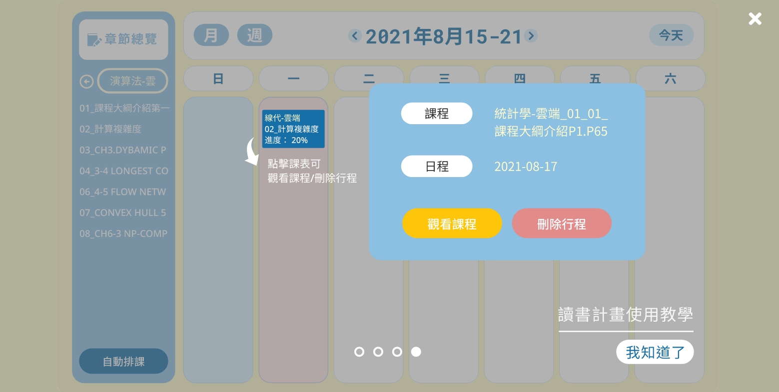 課程安排後可以點擊進行觀看課程或刪除行程。