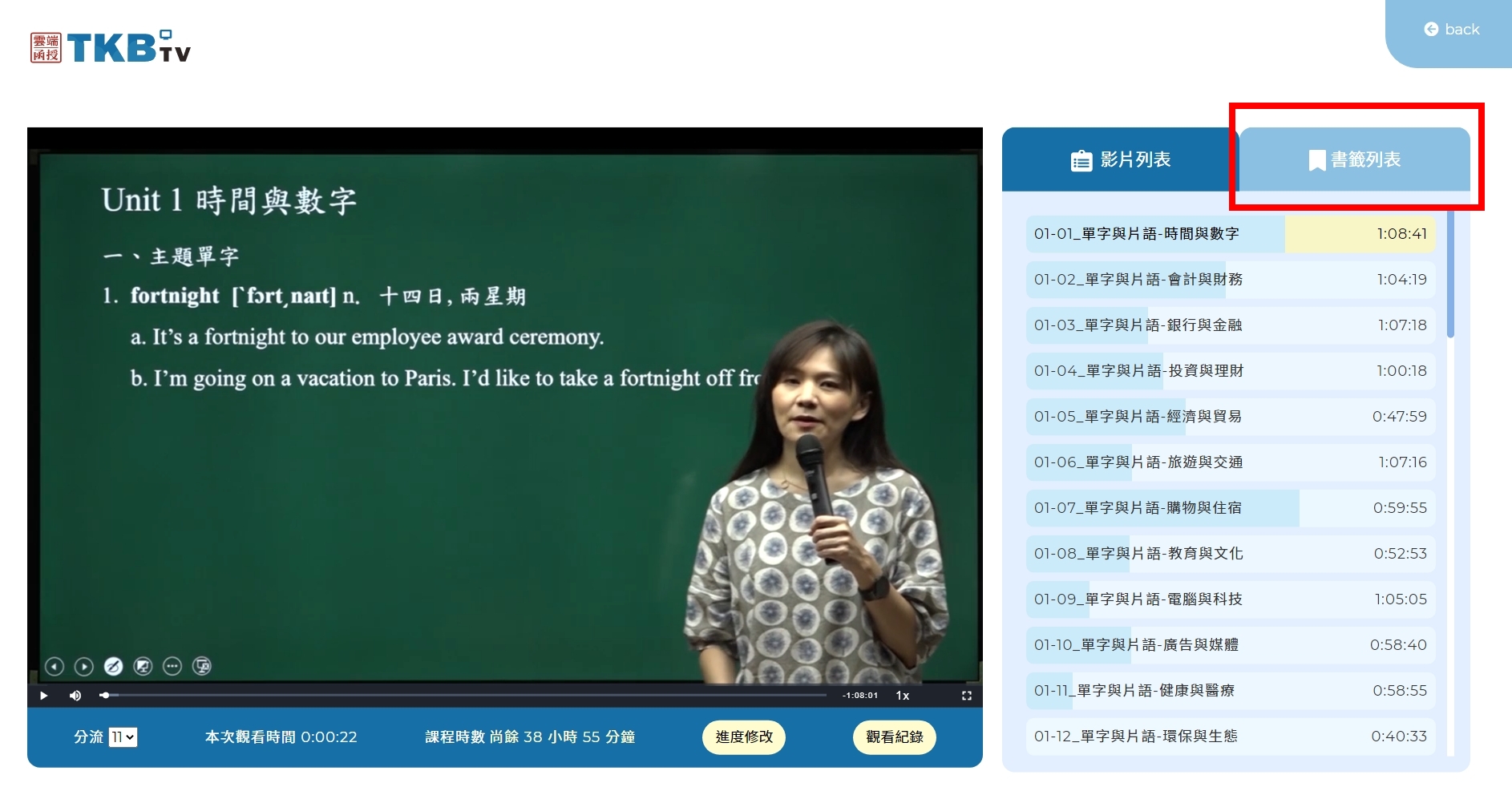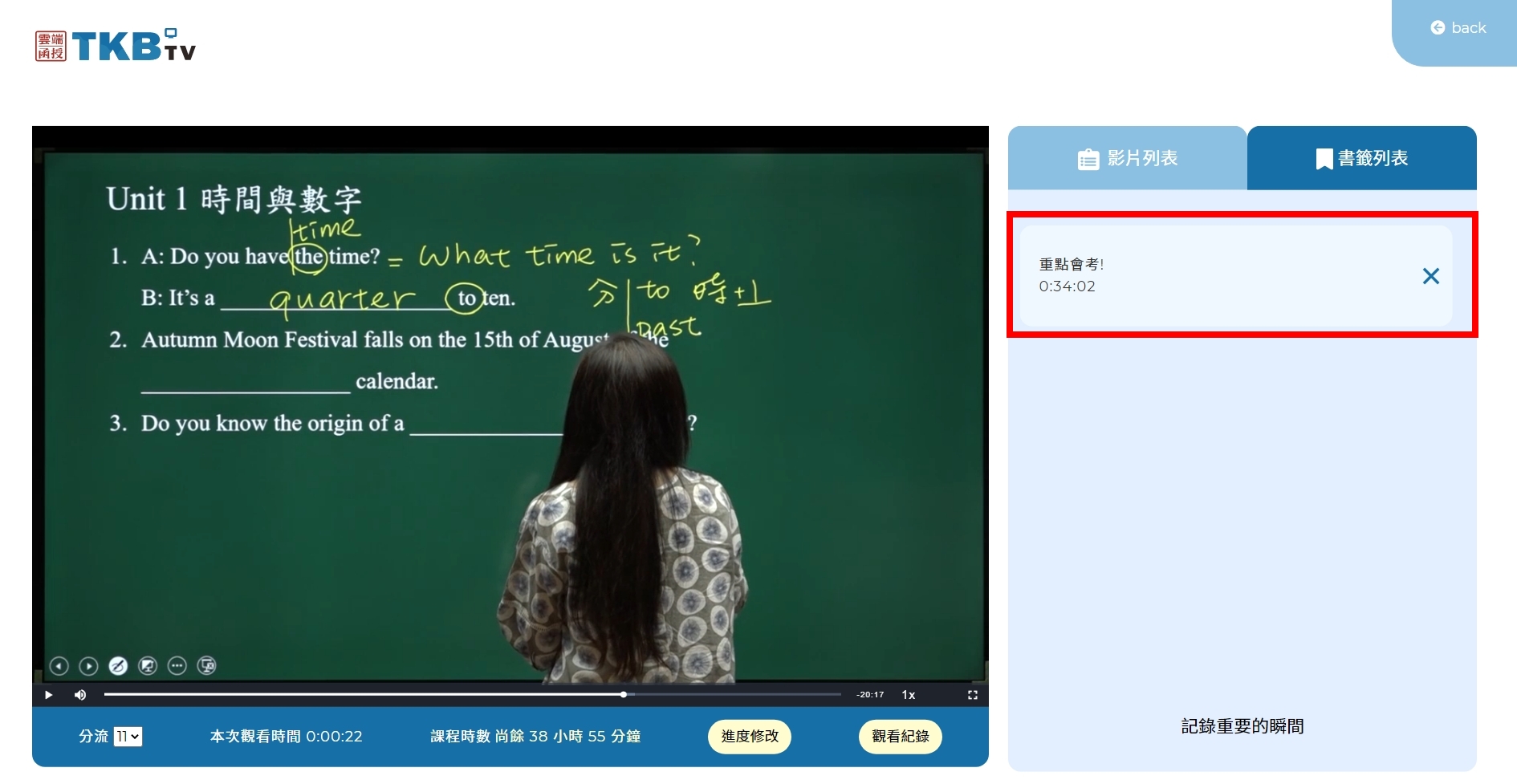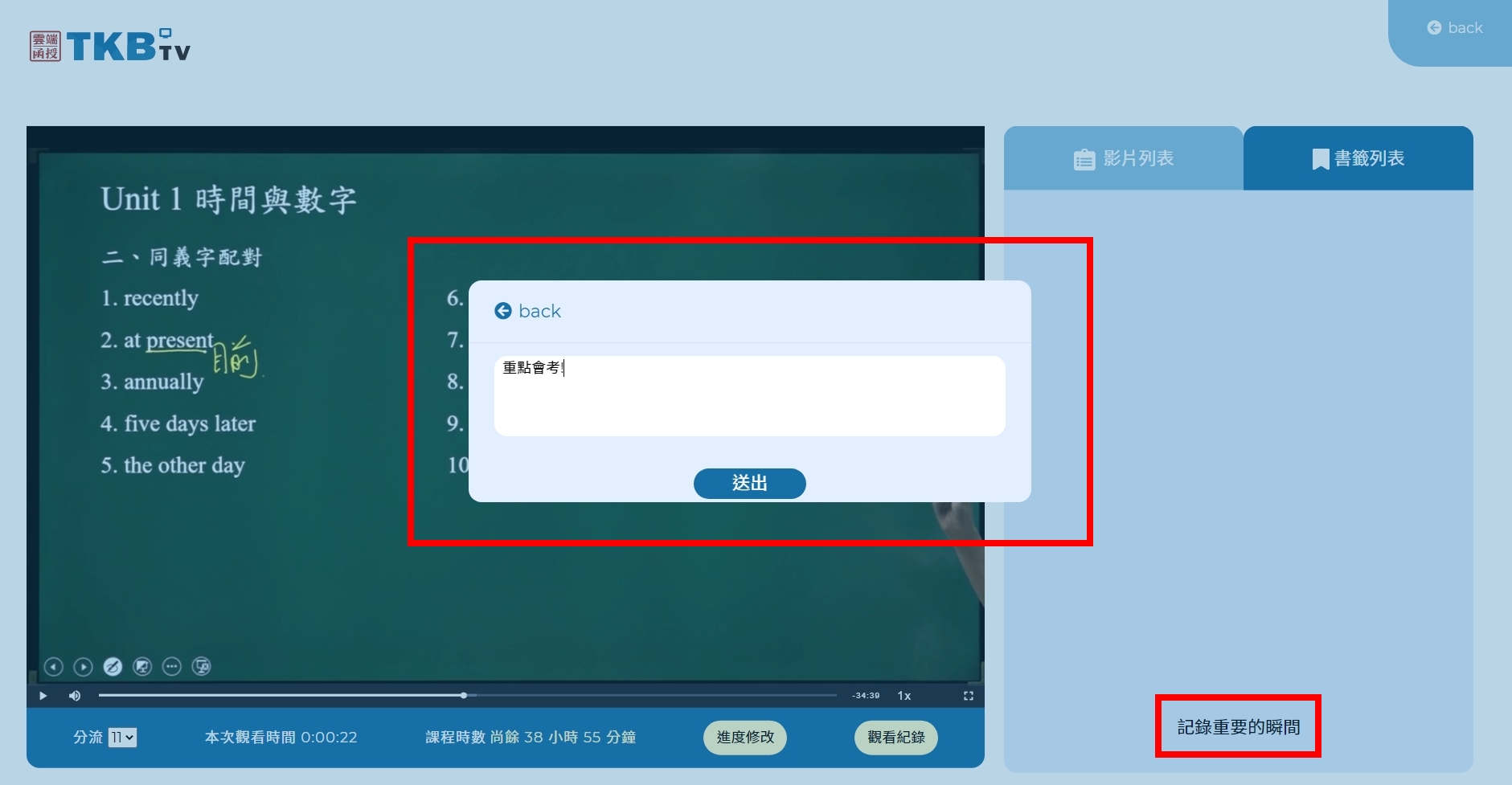 透過書籤功能可以使用文字紀錄該影片時間點,同學在複習影片時可以點擊記錄過的書籤直接到重點片段,對於未來複習可增加效率。